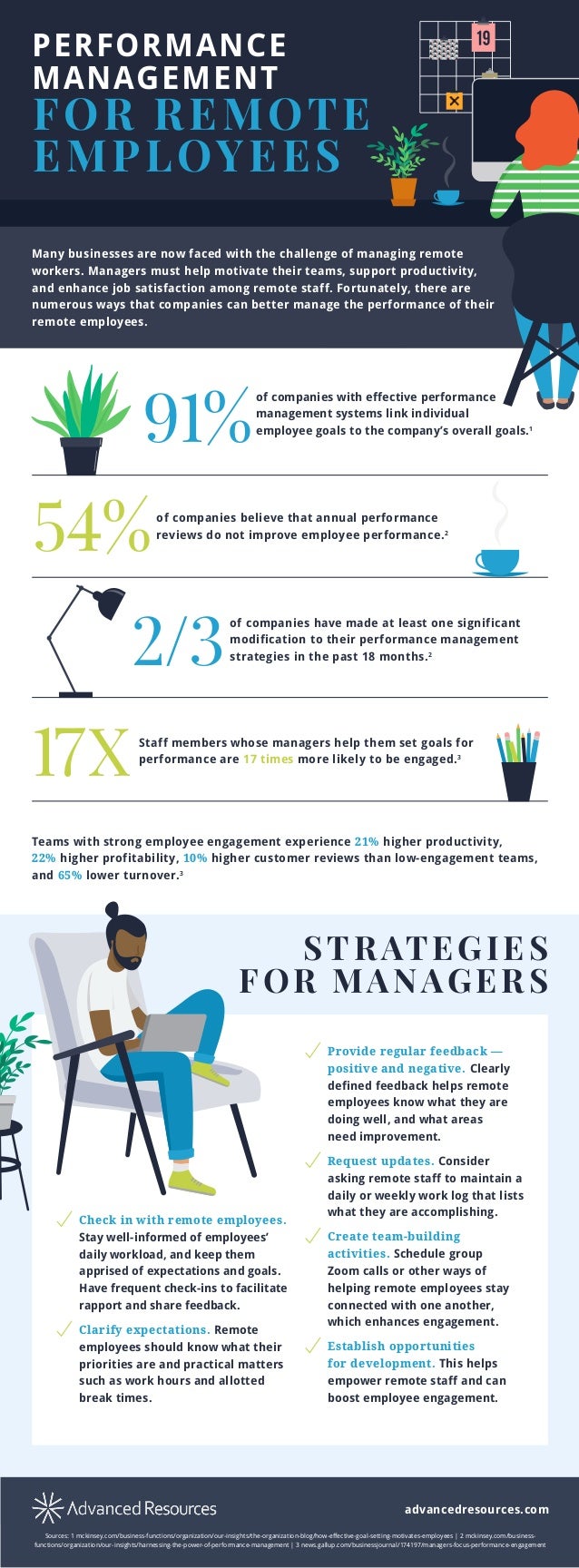 Another issue that affects employers and employees is how to manage the performance of remote staff. When employees work on-site, it’s easier to keep tabs on what types of work they are performing, offer feedback, and stay connected. Managing the performance of remote employees may take extra effort, but it can be done efficiently and fairly.